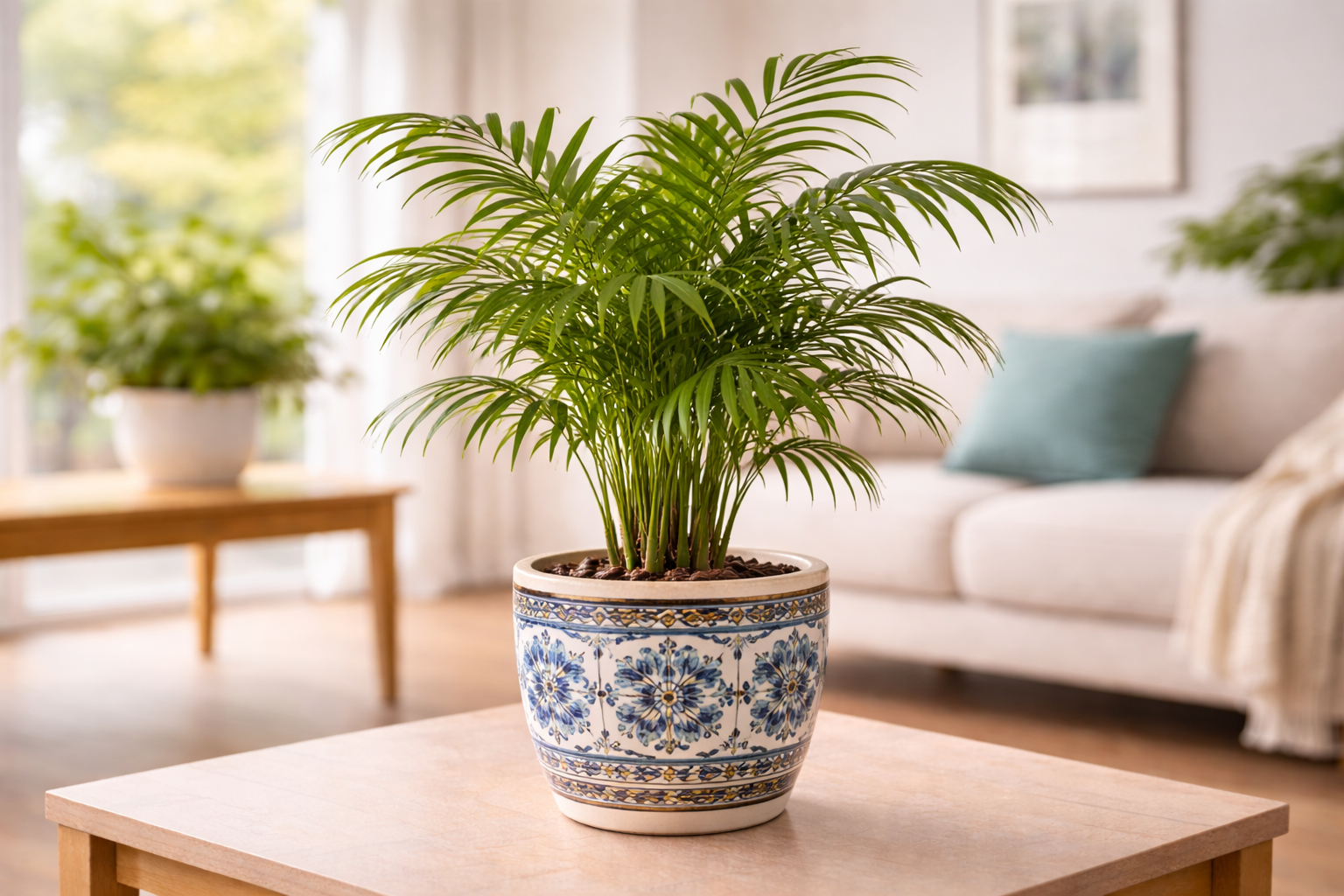 Крупные пальмы — такие как хамедорея или арека, которые добавят тропический акцент.