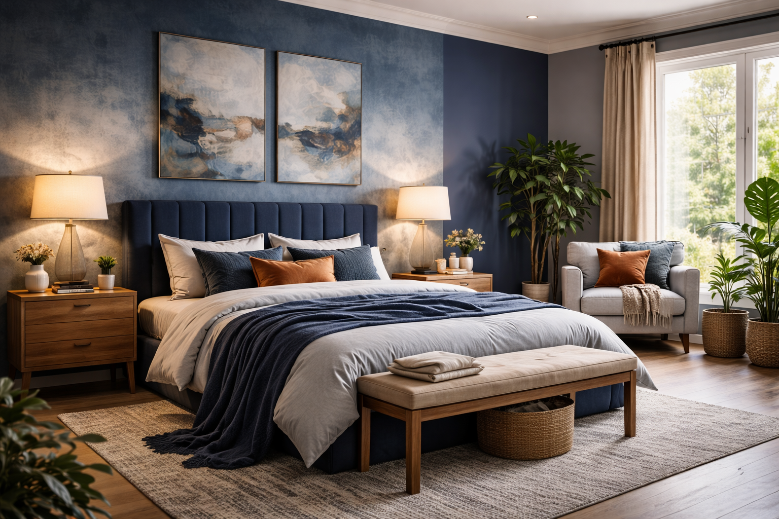 Сине-серые оттенки великолепно смотрятся в сочетании с белыми и светлыми акцентами, что позволяет достичь легкости и воздушности в оформлении. Добавление текстурированных тканей, таких как бархат или лен, придаст комнате стильный вид и уют. Кроме того, использование зелёных растений в сочетании с синими и сине-серыми оттенками наполнит пространство свежестью и энергией, создавая живое настроение в спальне.