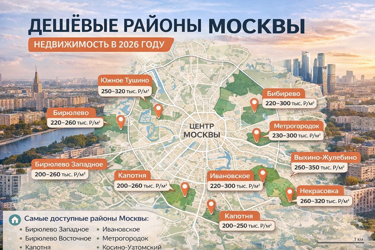 По данным MapEstate, самые дешёвые улицы Москвы в 2026 году сосредоточены в районах Бирюлёво, Капотня, Бибирево, Метрогородок и Некрасовка. В этих локациях стоимость квадратного метра может составлять от 200 000 до 300 000 рублей, что значительно ниже средней цены по рынку.