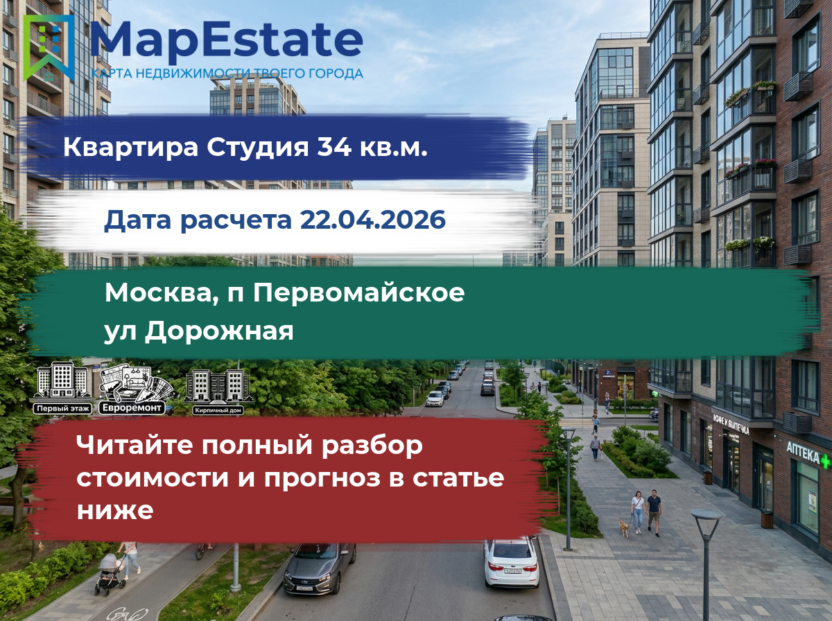 Сколько стоит квартира 34 м² в москва, п первомайское, ул дорожная?