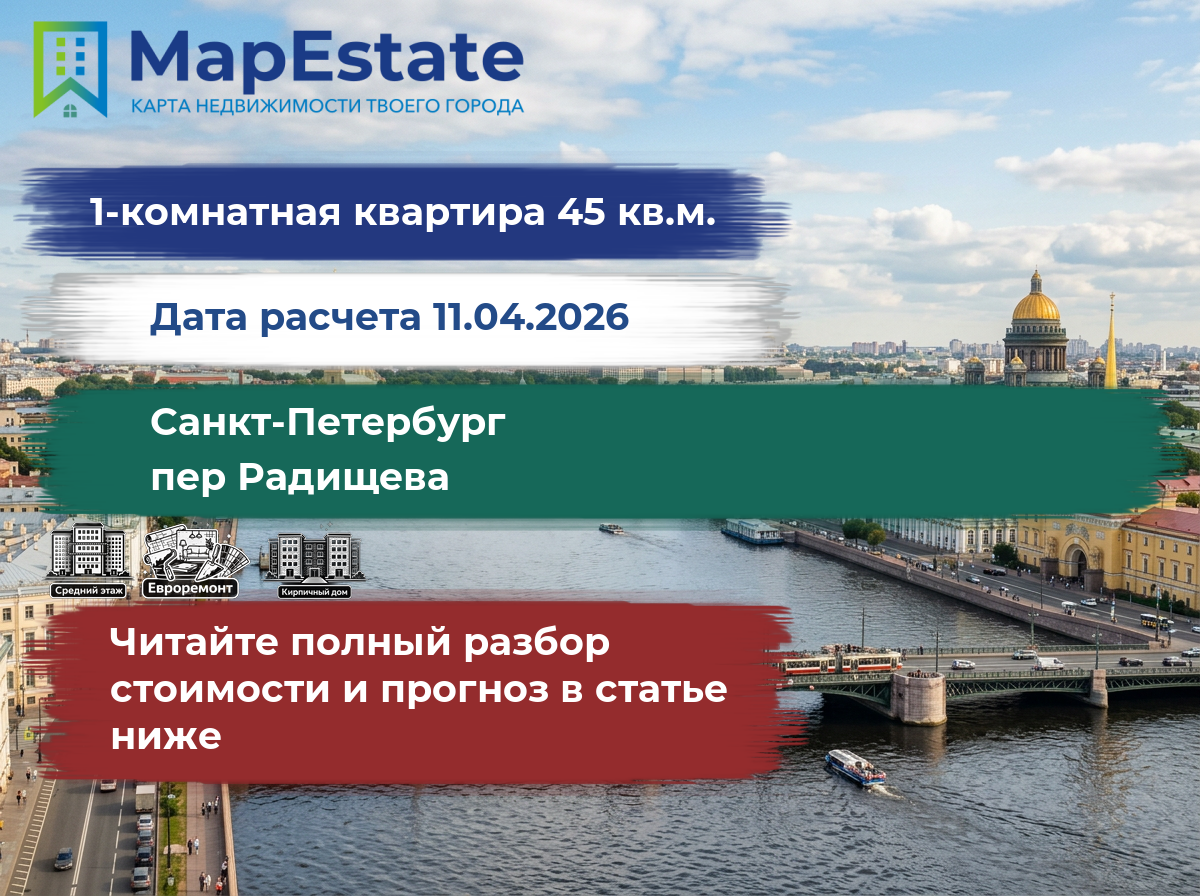 Квартира площадью 45 м² формата 1-комнатная на санкт-петербург, пер радищева относится к распространённым объектам жилой недвижимости.