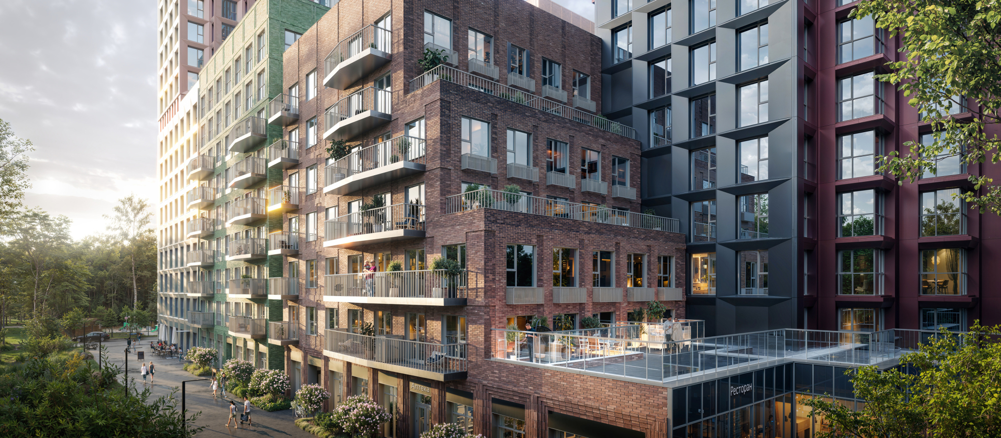 Архитектурная концепция от бюро «ХАДА-АРХИТЕКТС» объединяет в проекте акцентные высотные корпуса и малоэтажные здания. Квартал выделяется за счёт узнаваемого силуэта фасадов с цветовыми акцентами и продуманных внутренних пространств.