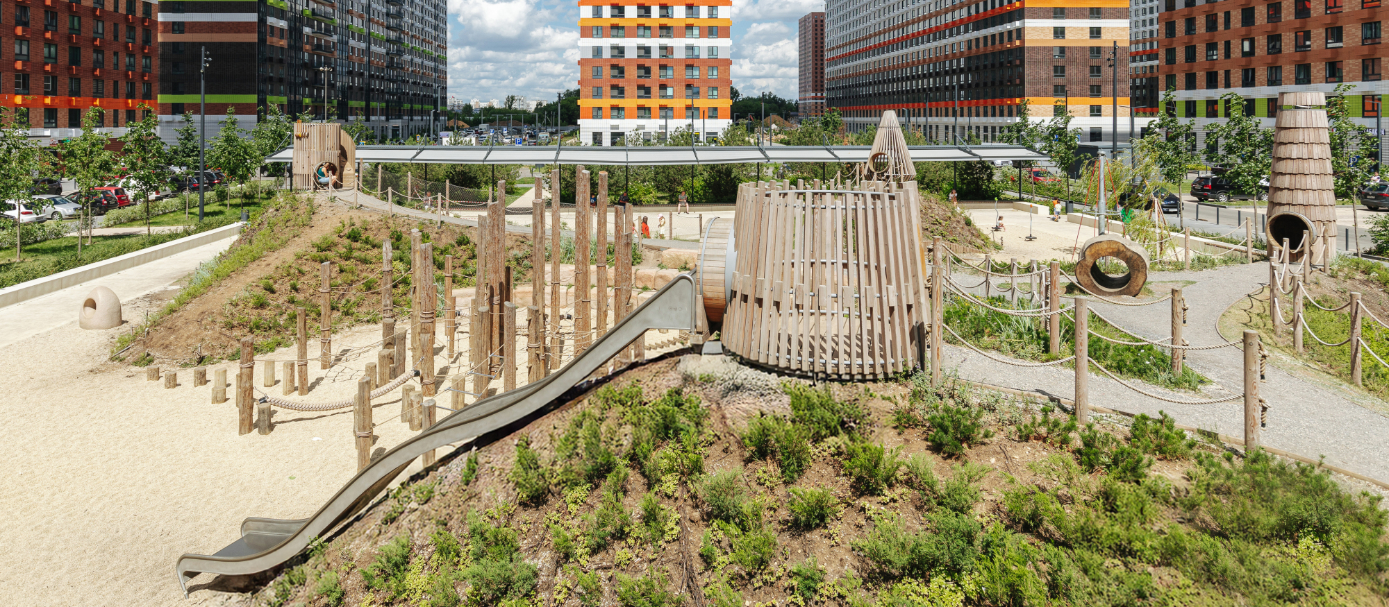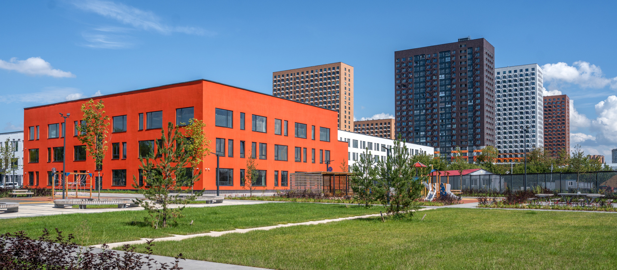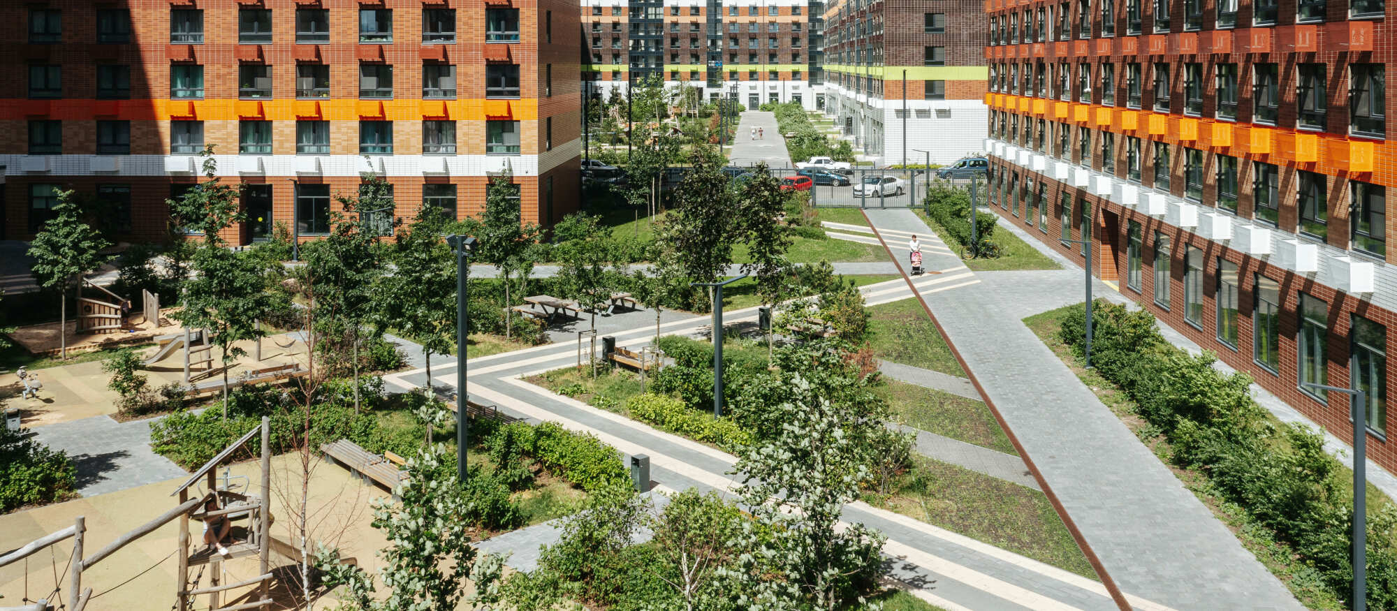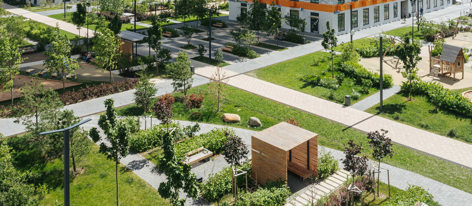 В проекте есть вся необходимая инфраструктура для комфортной жизни: три школы, семь детских садов и поликлиника. Между домами проходит пешеходный бульвар, где можно кататься на велосипеде, гулять и отдыхать от городской суеты. В зелёных дворах без автомобилей — детские площадки и места для отдыха. Для детей разного возраста есть большая игровая площадка PlayHub «Остров». На первых этажах откроются магазины, кафе и другие сервисы, а на подземных этажах — паркинги.