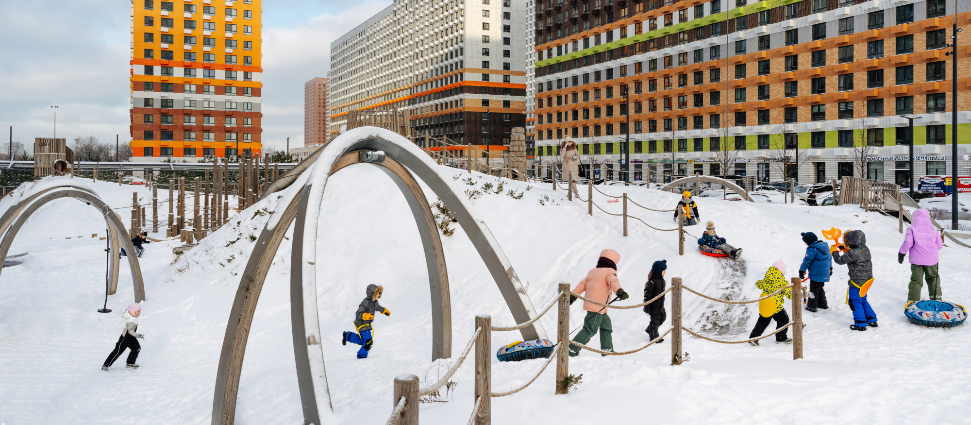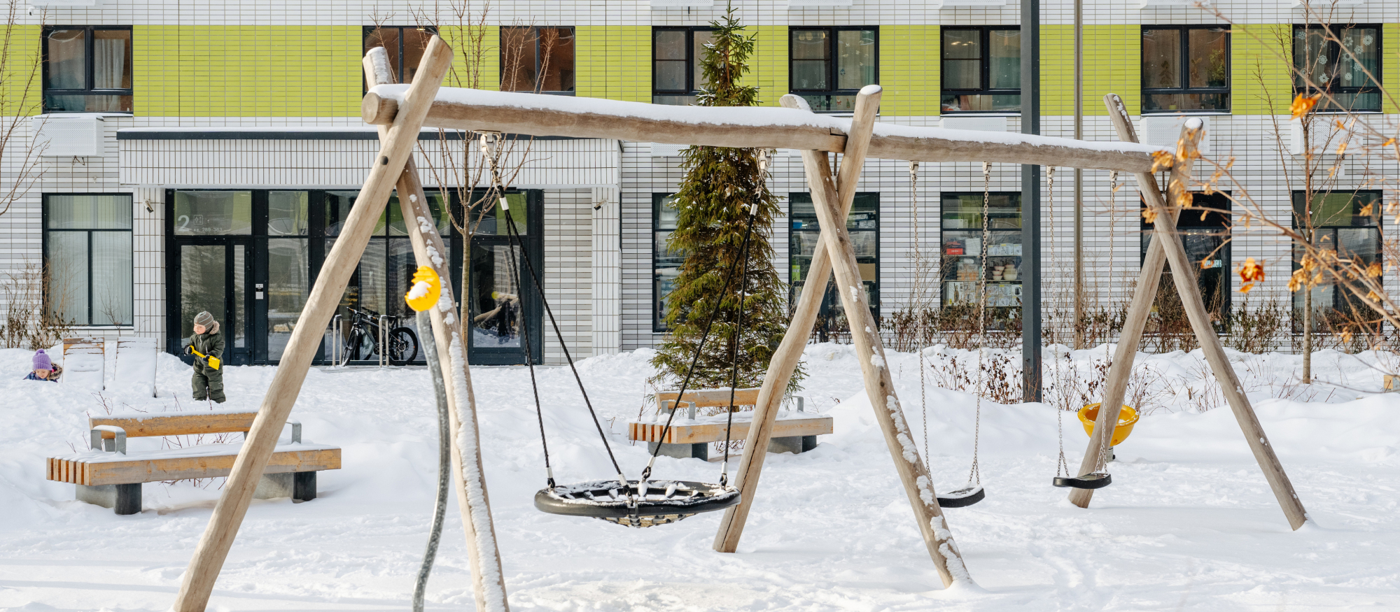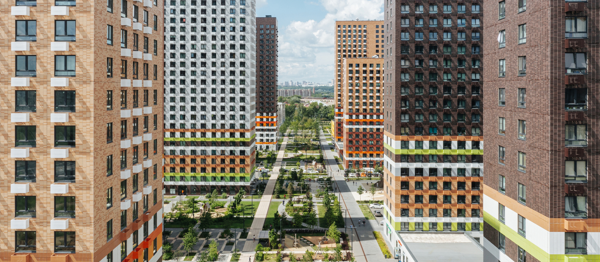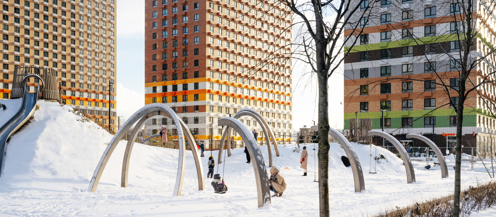 В проекте есть вся необходимая инфраструктура для комфортной жизни: три школы, семь детских садов и поликлиника. Между домами проходит пешеходный бульвар, где можно кататься на велосипеде, гулять и отдыхать от городской суеты. В зелёных дворах без автомобилей — детские площадки и места для отдыха. Для детей разного возраста есть большая игровая площадка PlayHub «Остров». На первых этажах откроются магазины, кафе и другие сервисы, а на подземных этажах — паркинги.