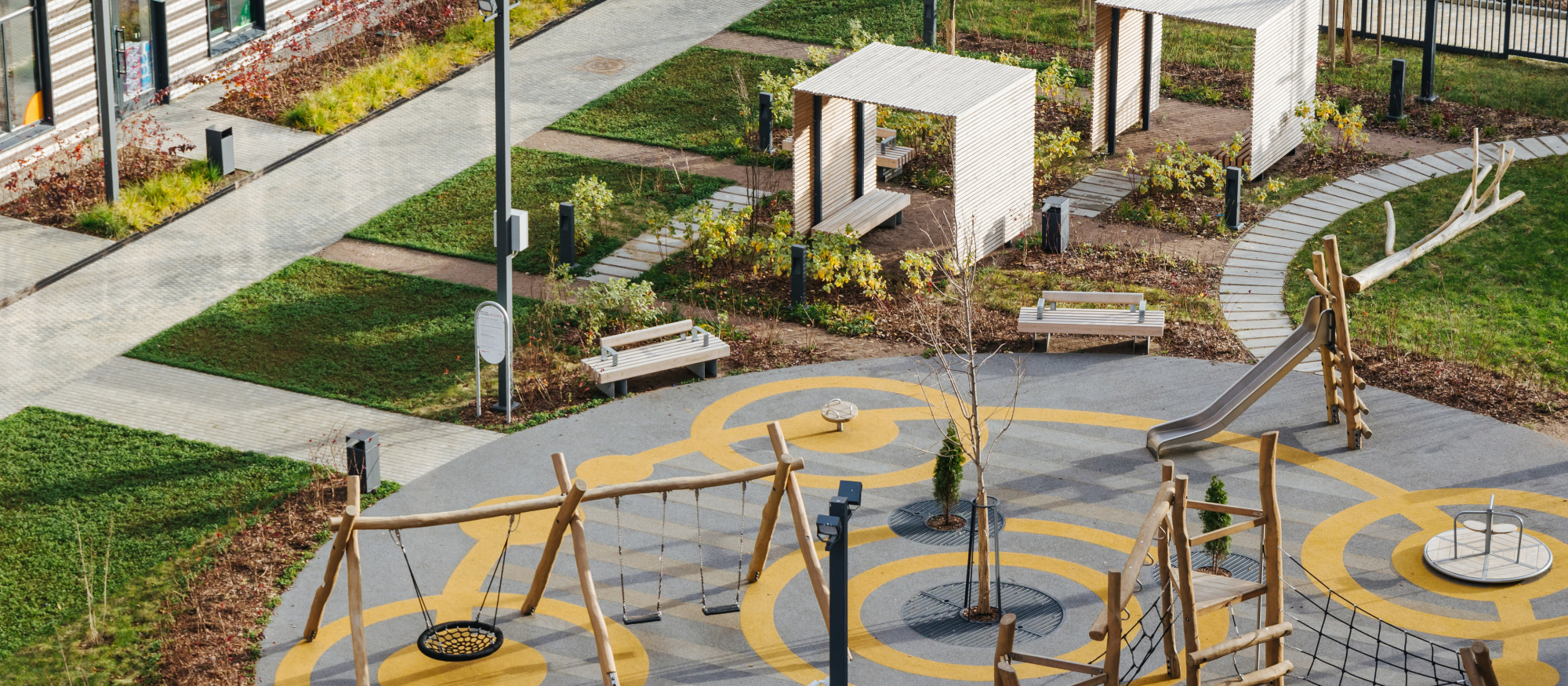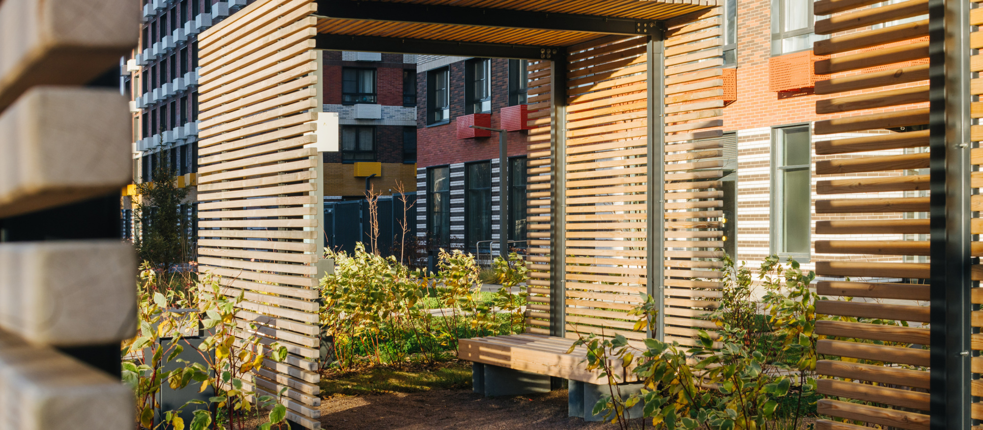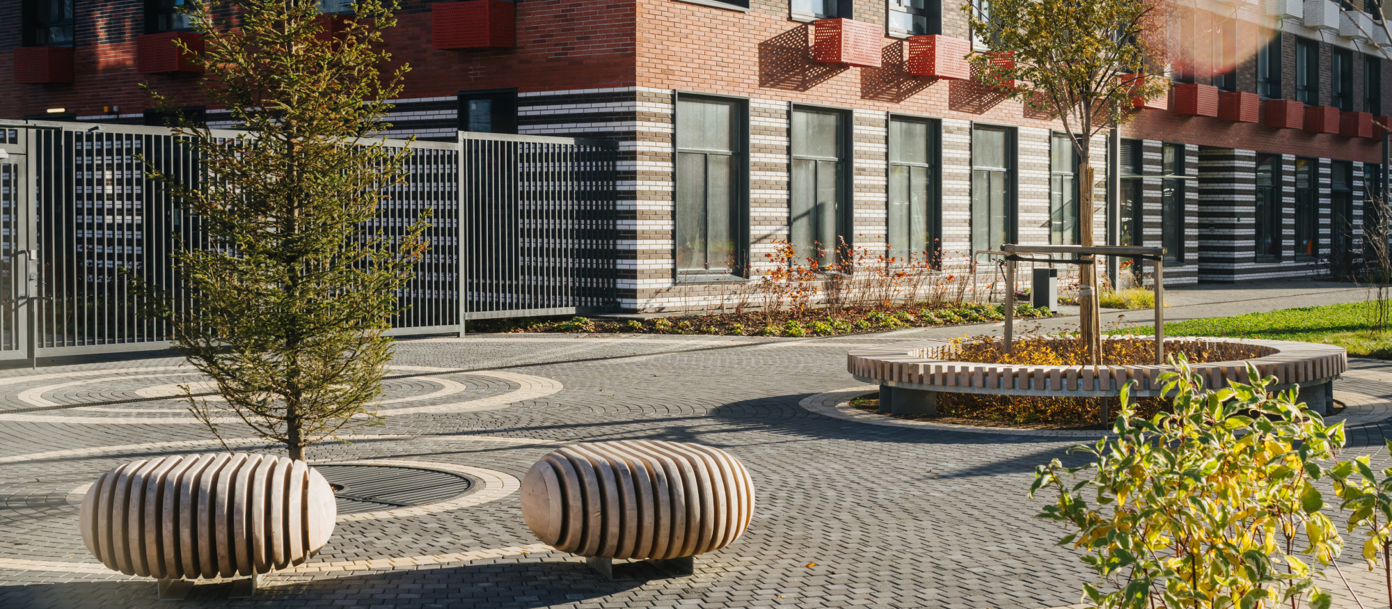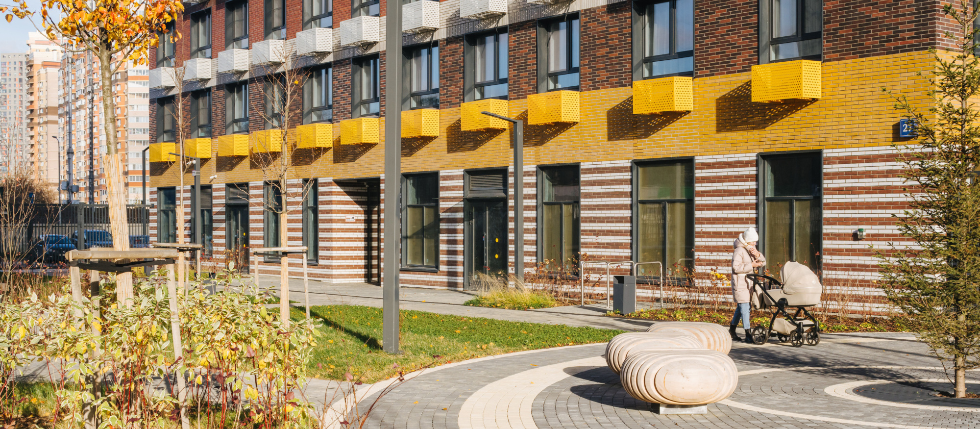 Двор застройщик закроет для машин. Для автомобилей строятся подземные и наземные парковки совокупной вместительностью 2665 машиномест. На территории высадят деревья и кустарники, устроят игровые и спортивные площадки.