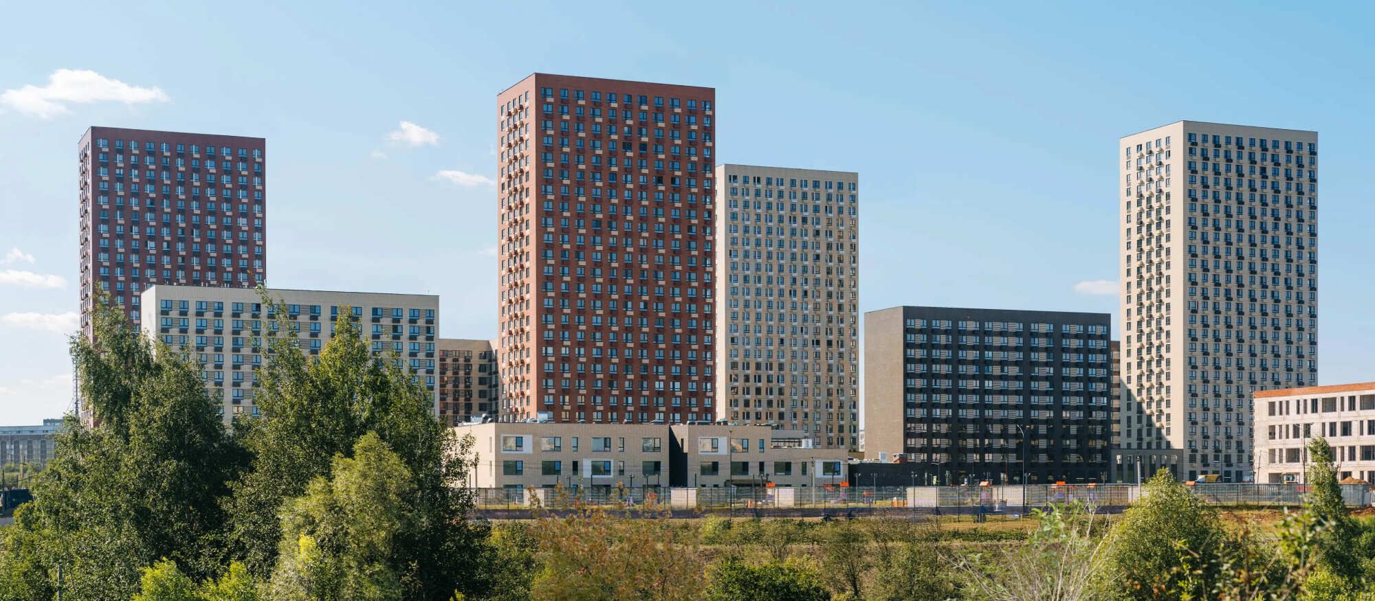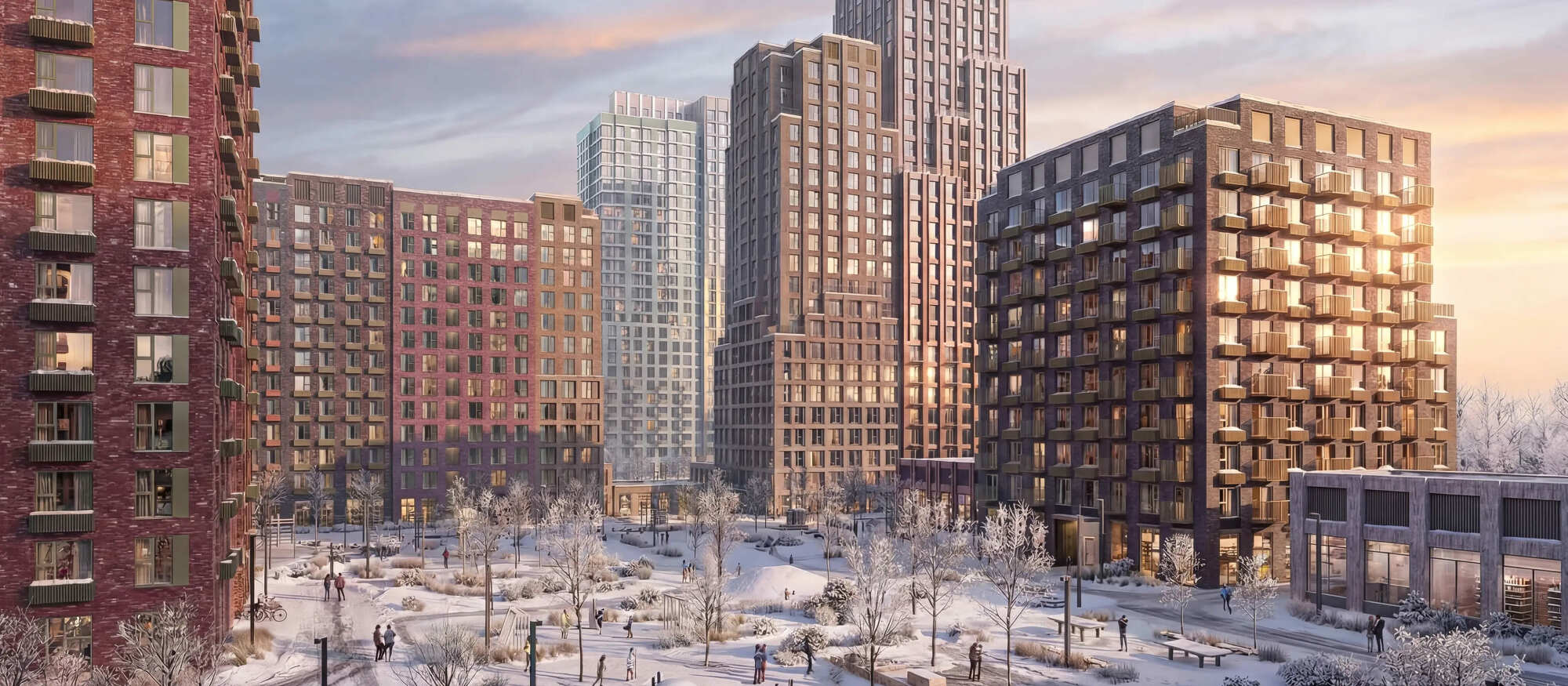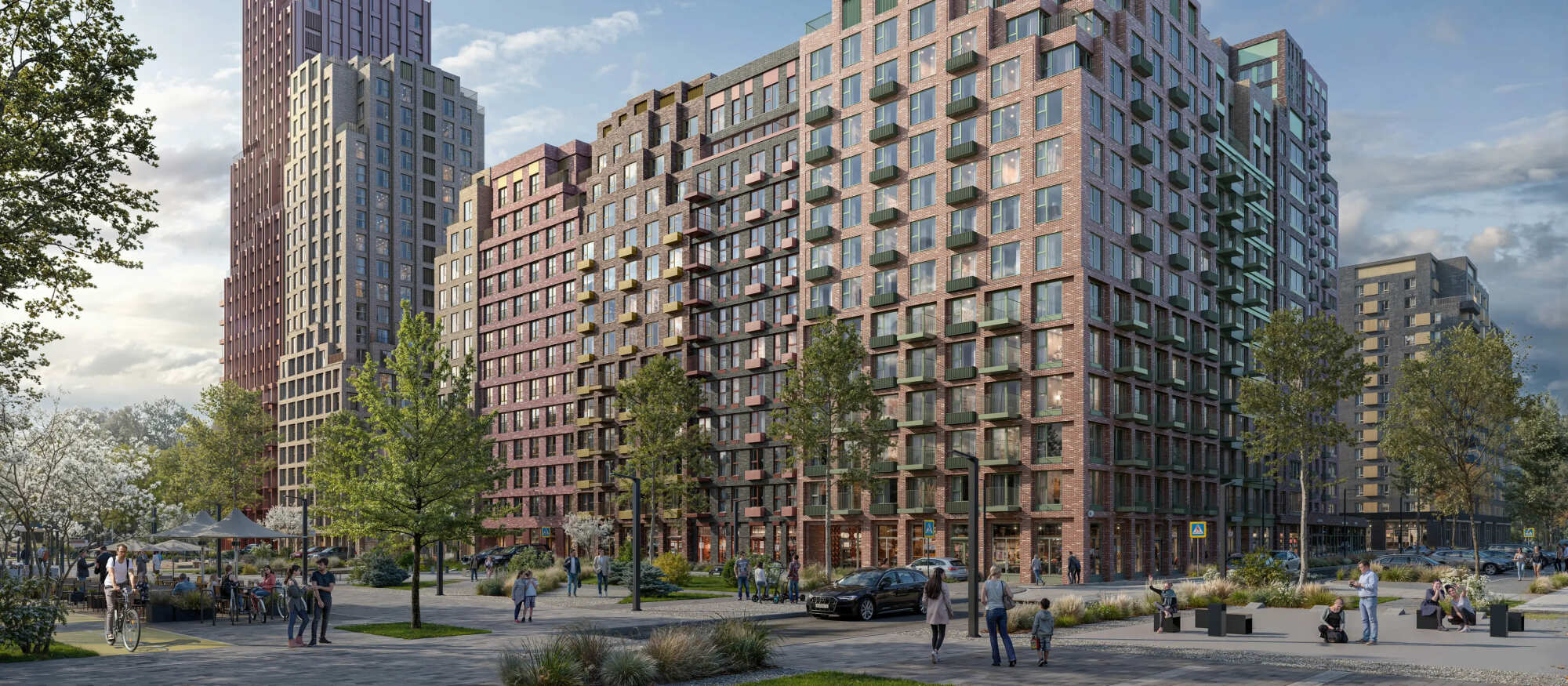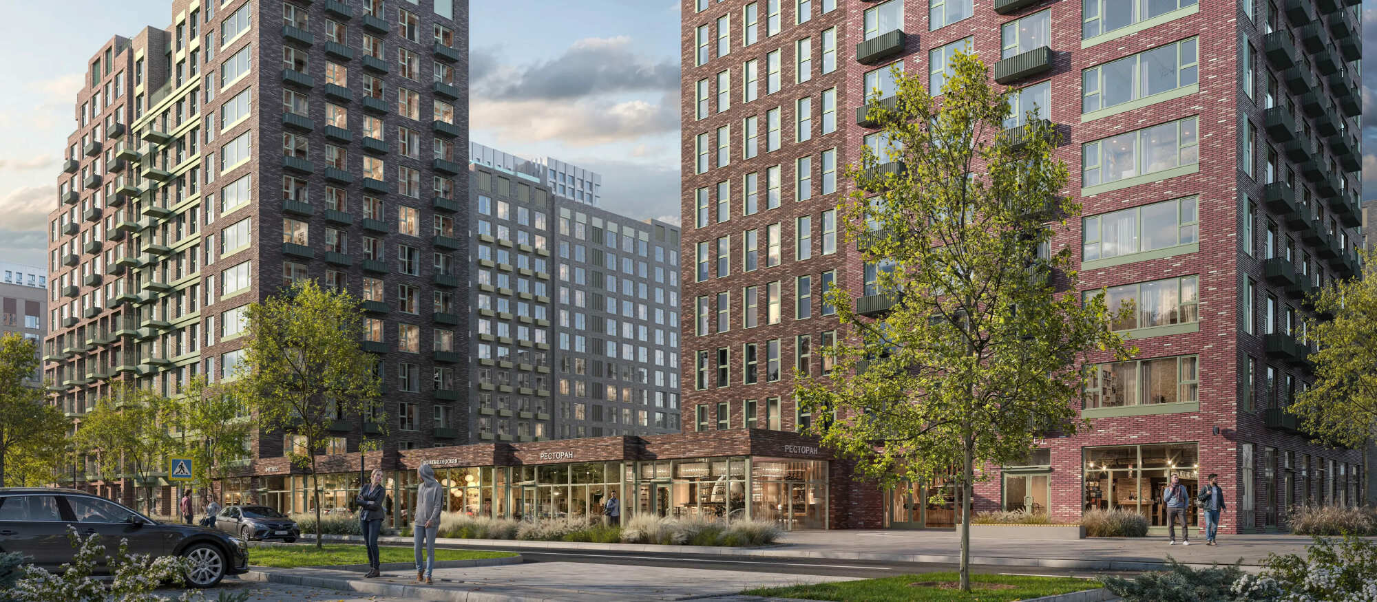 Квартал состоит из разноэтажных домов со ступенчатыми фасадами. Цветовая палитра проекта спокойная: оттенки белого и коричневого сочетаются с пастельным розовым и мятным.