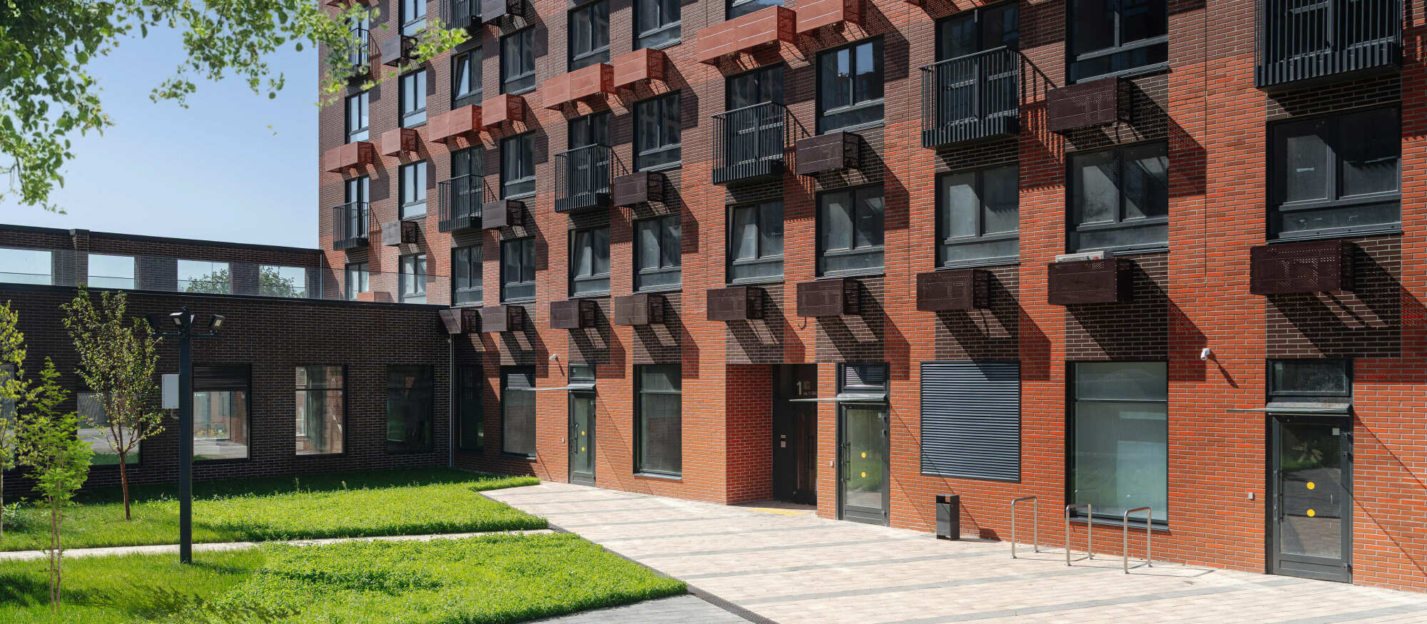 Первые этажи — светлые и просторные. Высокие потолки, белые стены и стеклянные двери визуально увеличивают пространство. Для удобства жителей у подъездов два выхода, которые ведут на улицу и во двор-парк.