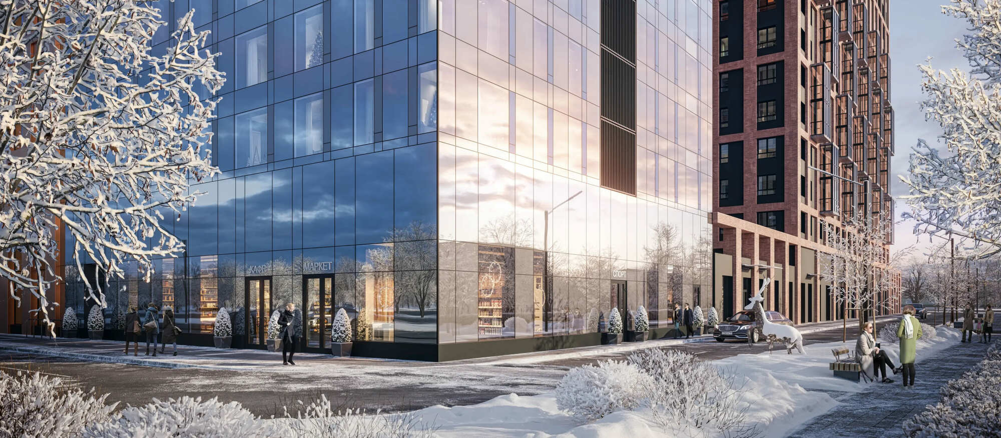 Благодаря архитектуре, квартал как бы перекликается со стеклянными фасадами высоток Москва-сити и Останкинской башней, которые отсюда видно — вместе с тем являясь естественной частью именно этого места, гармонично дополняя его облик.