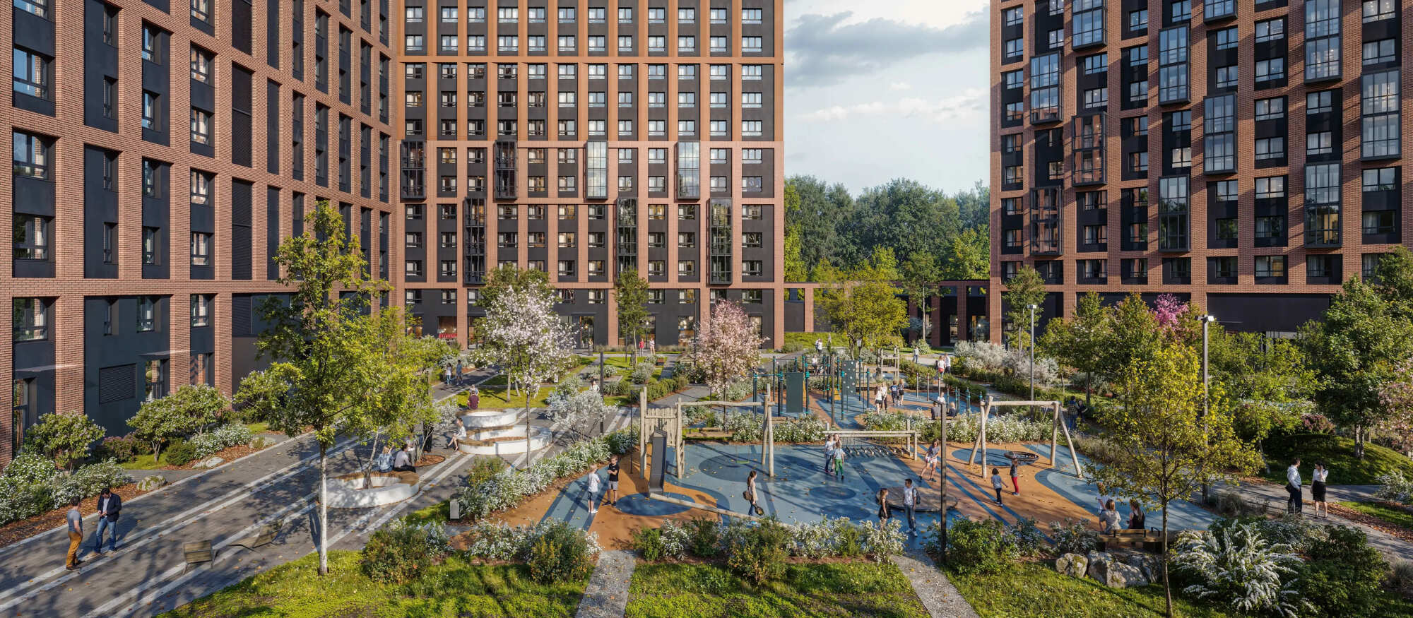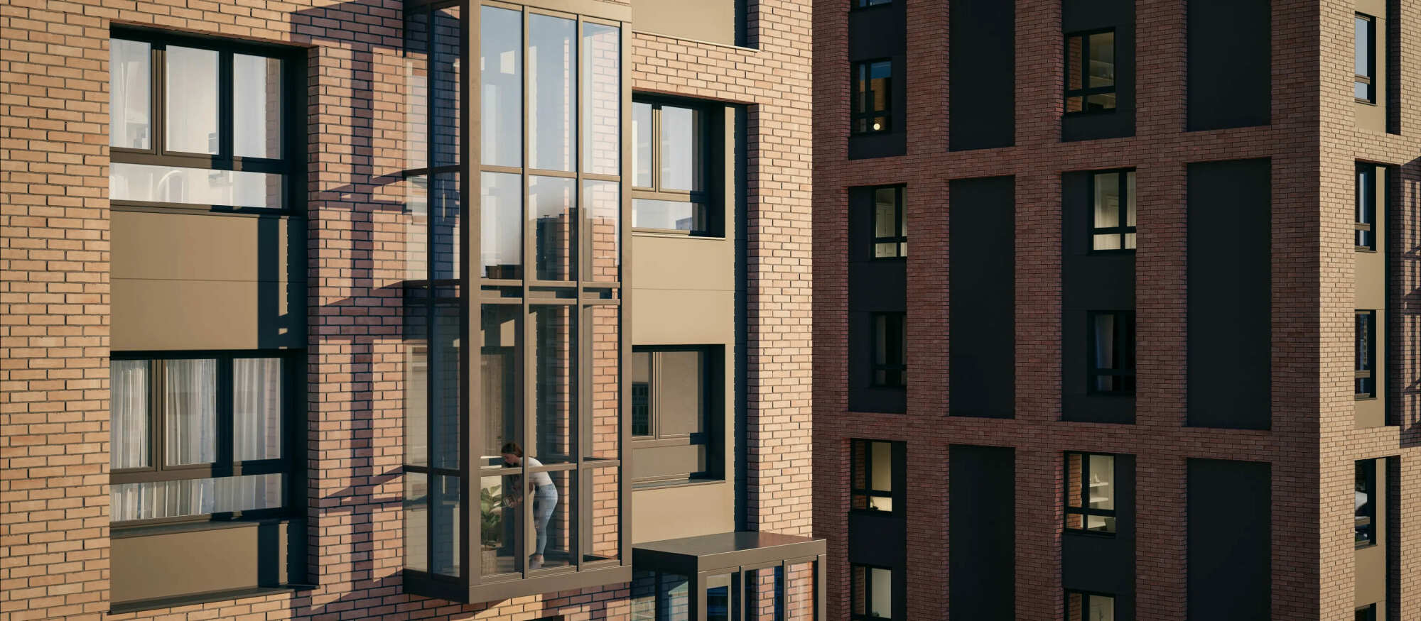 У домов необычные фасады: над ними работали два архитектурных бюро — голландцы de Architekten Cie и российская студия Kamen Architects. В некоторых квартирах есть панорамные балконы.