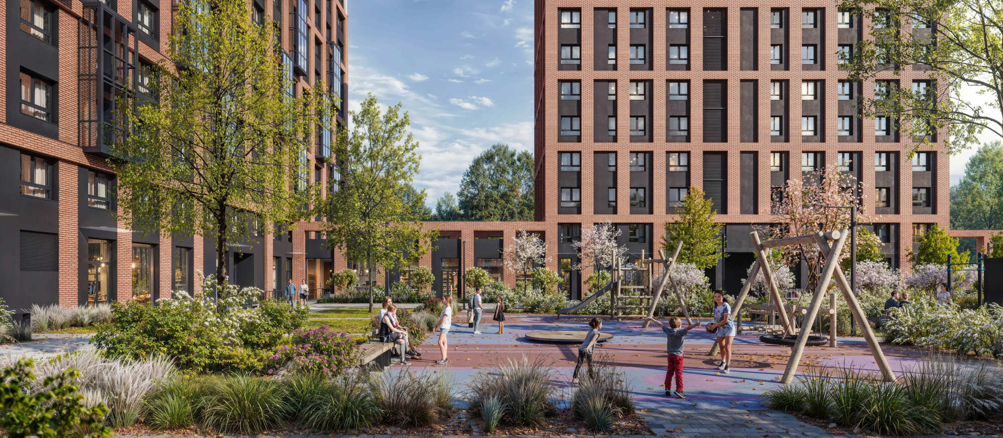 На первых этажах светлые и просторные лобби, а на территории квартала будет собственный детский сад.