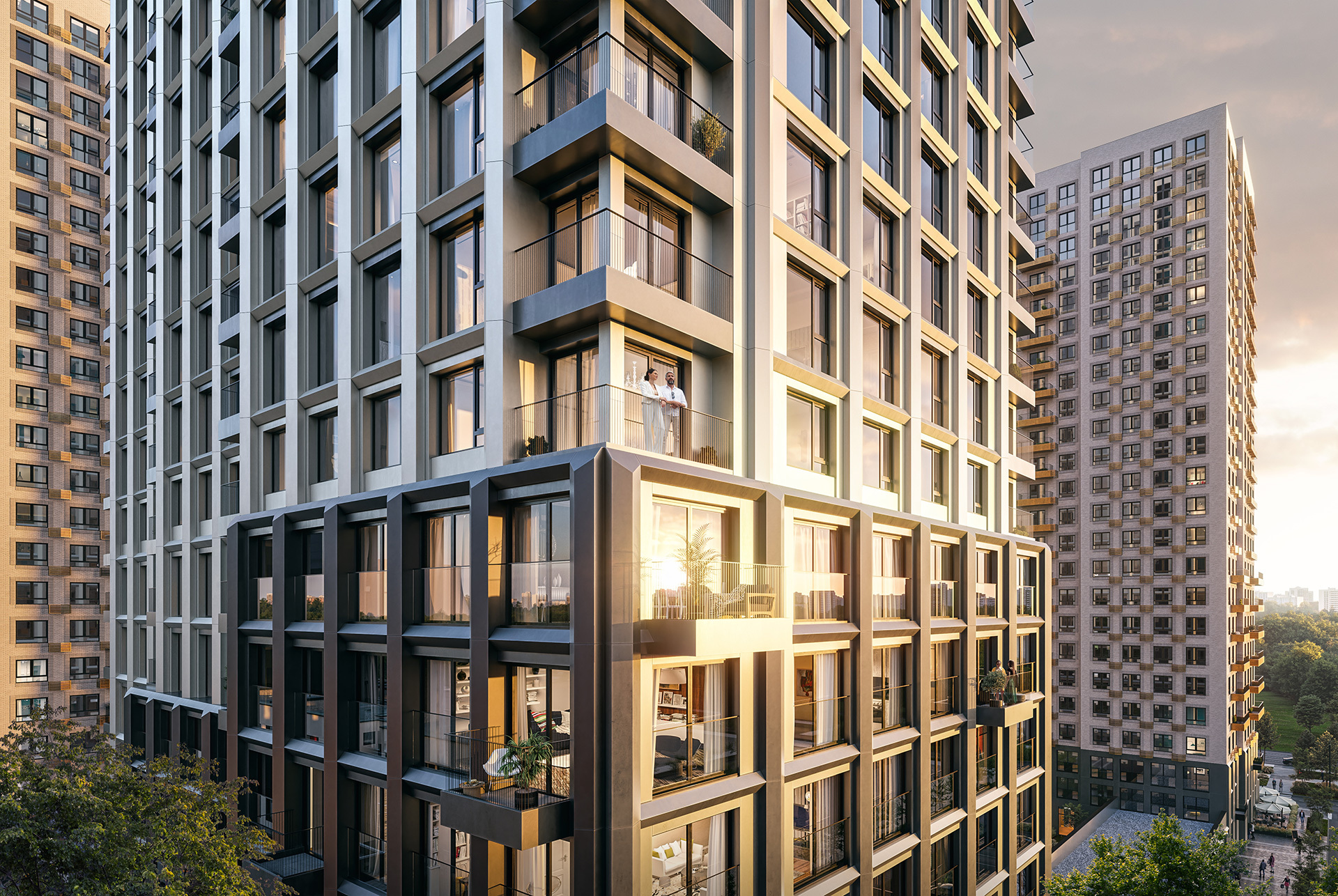 Архитектуру корпусов 1.3–1.4 разрабатывало российского бюро М.А.М. Самое высокое здание проекта — корпус 1.4 высотой 32 этажа. Его уникальная особенность — панорамное остекление со стемалитовыми вставками. Выразительный облик доминанты дополняет корпус 1.3, рельеф которого словно находится в постоянном движении. Высота этого здания — 20 этажей.