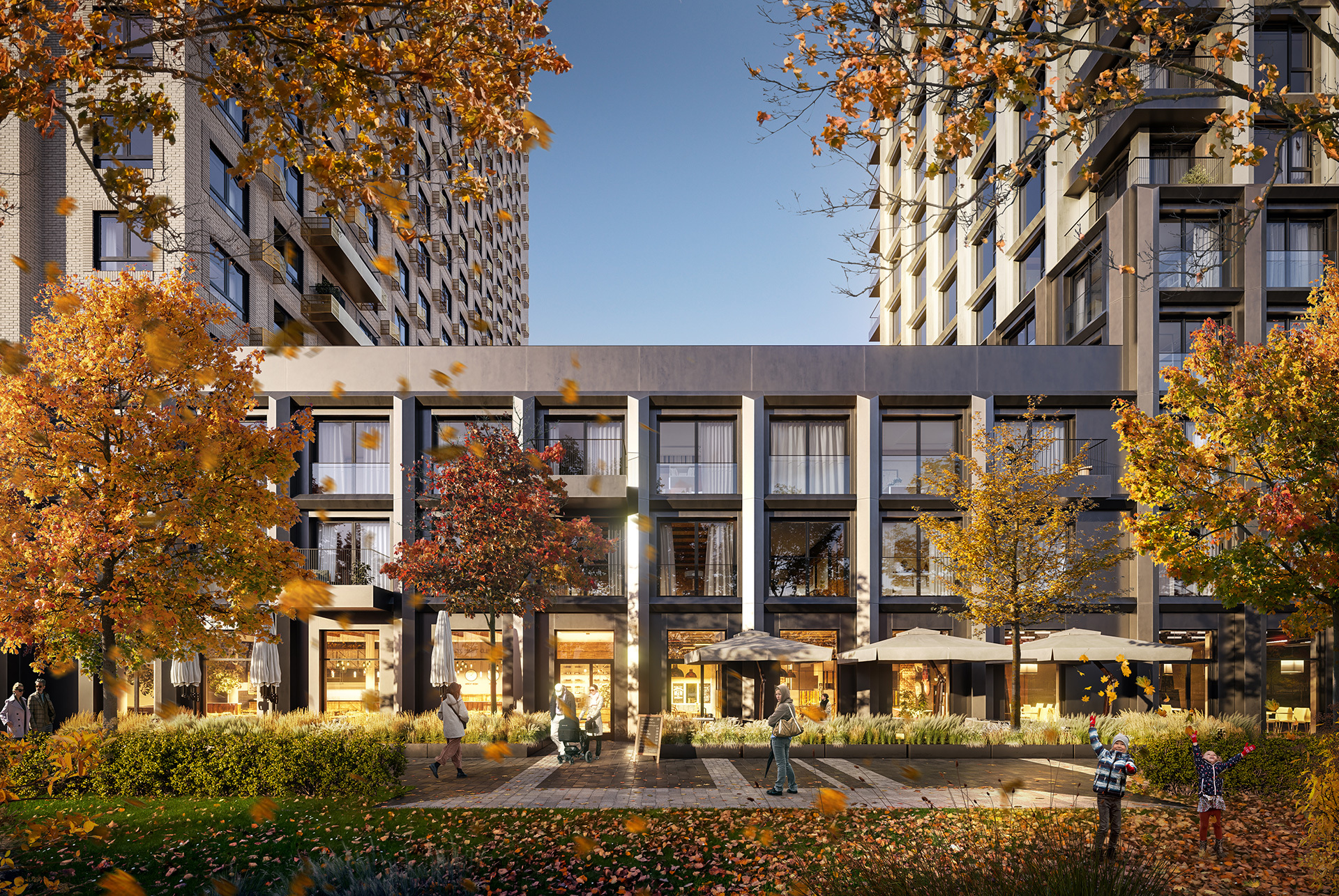 Все корпуса объединяет общий контур нижних этажей, которые образуют уютные галереи с магазинами, кафе и полезными сервисами у дома..