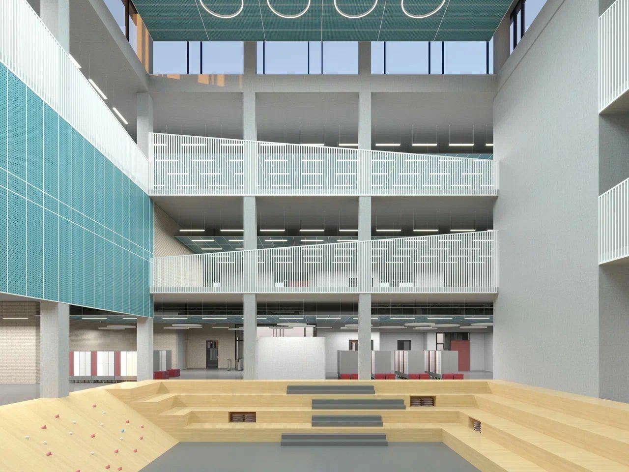 Точкой притяжения всех школьников станет атриум проходящий через три этажа. Его, благодаря инновационным проектным решениям и современному оборудованию, можно использовать как лекторий, выставочную зону, кинотеатр, танцевальный или концертный зал. От же будет выполнять роль общественного пространства, тут смогут общаться школьники разных возрастов, что является важной составляющей развития социальных навыков.