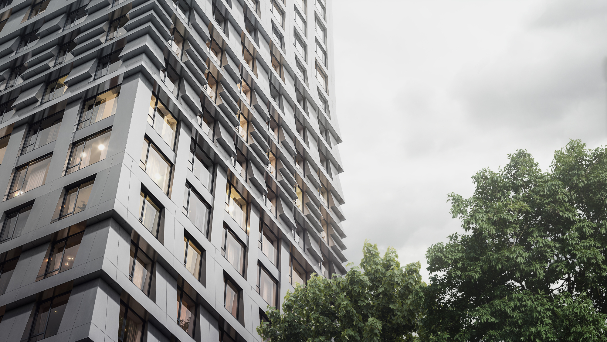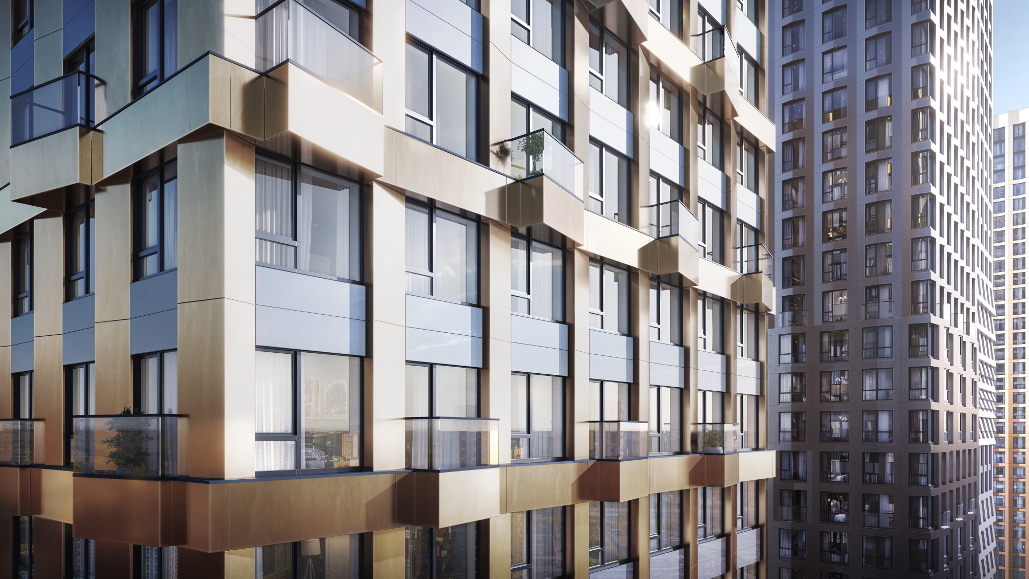 Корпус 2.4 сочетает 23-этажный сегмент в тёплых латунных тонах с более лаконичной 18-этажной частью с белым фасадом. Такой подход делает квартал выразительным, силуэтным и легко узнаваемым на фоне городской застройки.