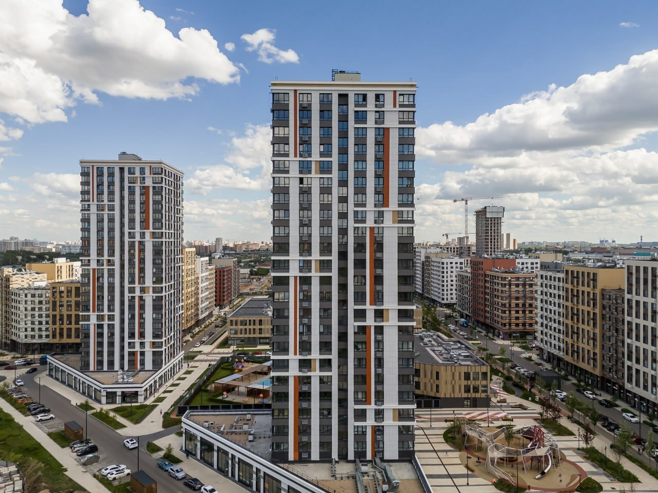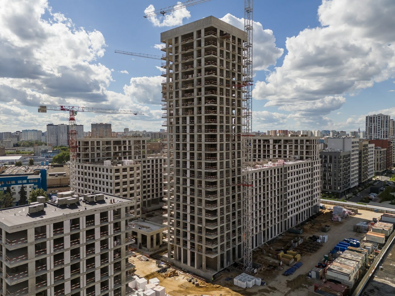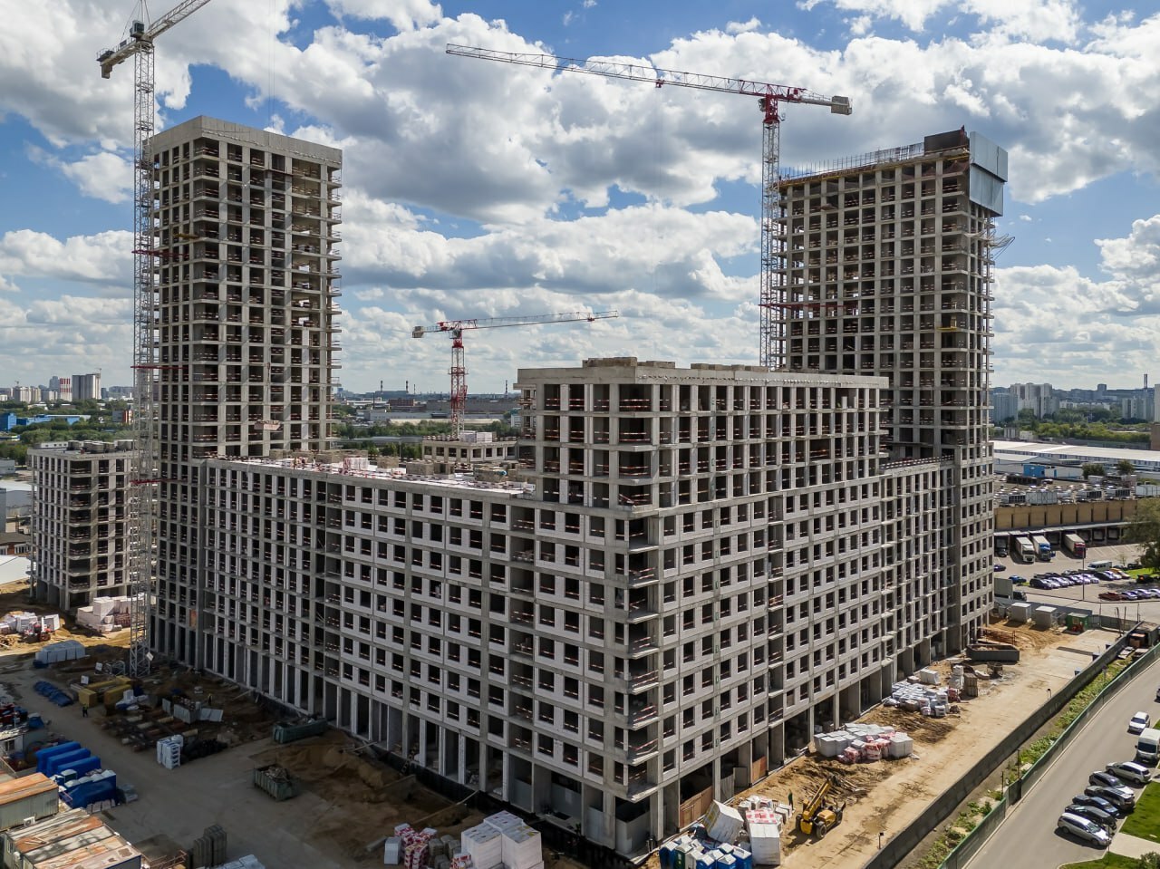 Почти за девять месяцев построены два жилых корпуса от 9 до 25 этажей площадью 81 тыс. кв. м. Выполнено бетонирование монолитного каркаса объемом более 38,5 тысяч кубометров. В настоящее время завершены внешняя и внутренняя кладка стен и перегородок, активно ведутся работы по кровле. К монтажу фасадов планируется приступить осенью.