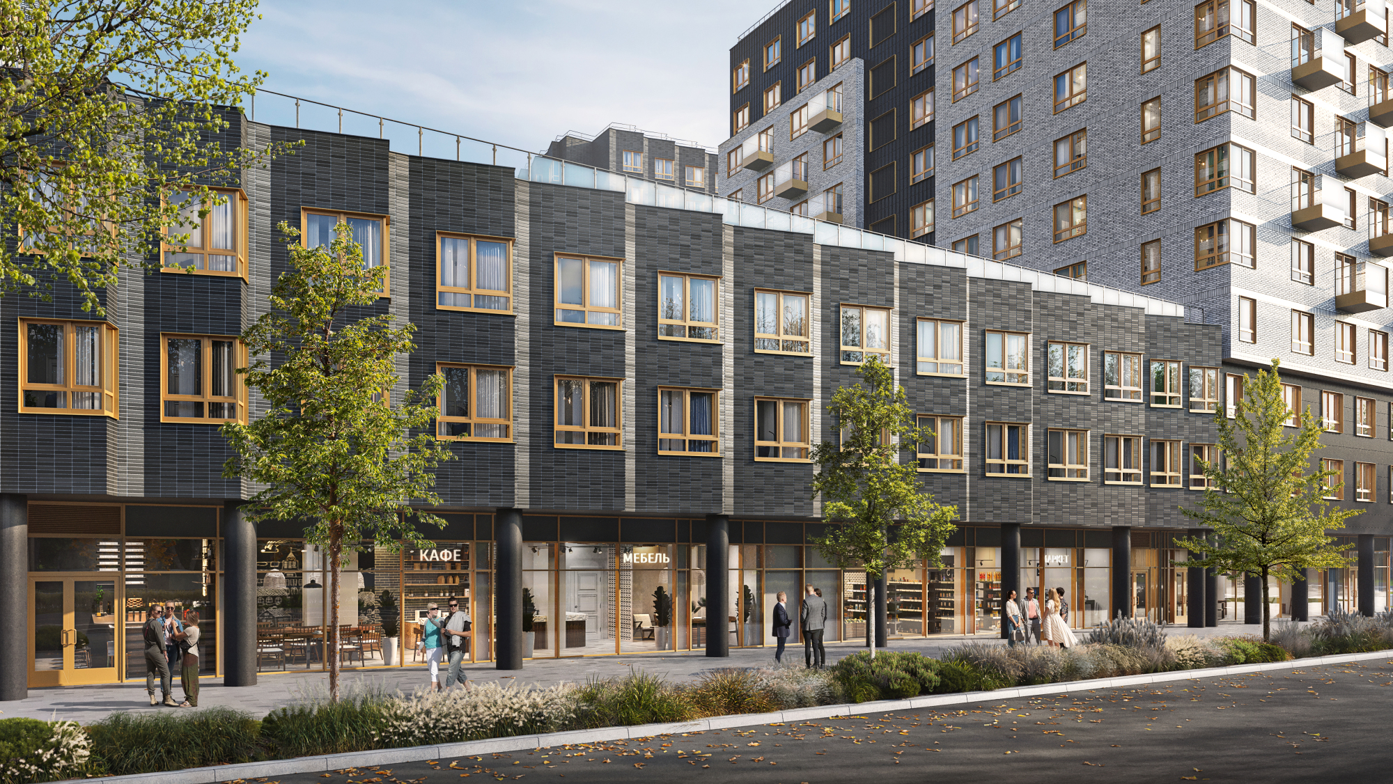 Архитектурные приёмы формируют связь с городским контекстом: низкоэтажные корпуса естественно вписываются в окружающий ландшафт, в то время как 32-этажная башня добавляет вертикальный акцент, усиливающий общий облик квартала.