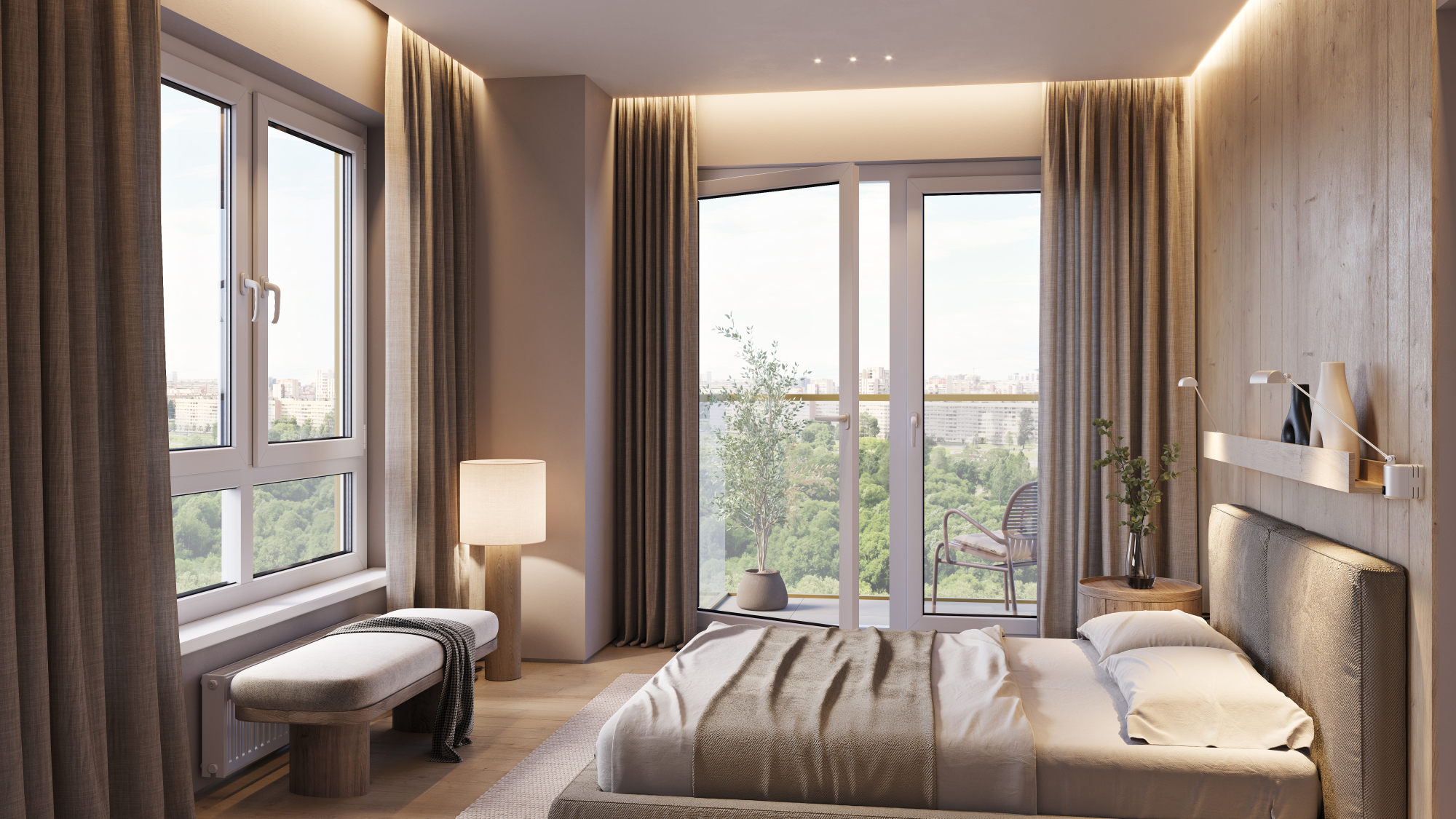 В «Кронштадтском 9» можно выбрать квартиру с угловыми окнами: они визуально расширят комнату и сделают пространство легче и светлее. В каждом новом корпусе будут террасы: с одной из них, расположенной в башне-доминанте, будет открываться ошеломляющий вид на реку Химку. А в 12-этажных корпусах будут балконы — обычные открытые и французские.