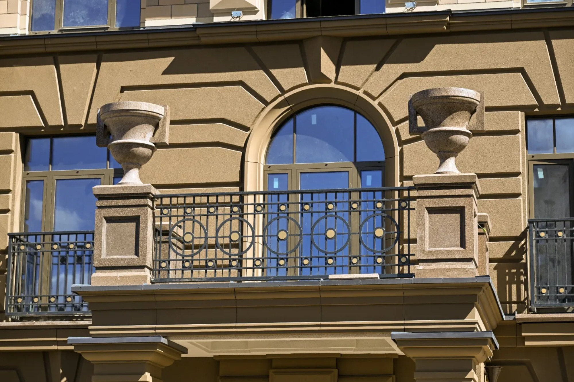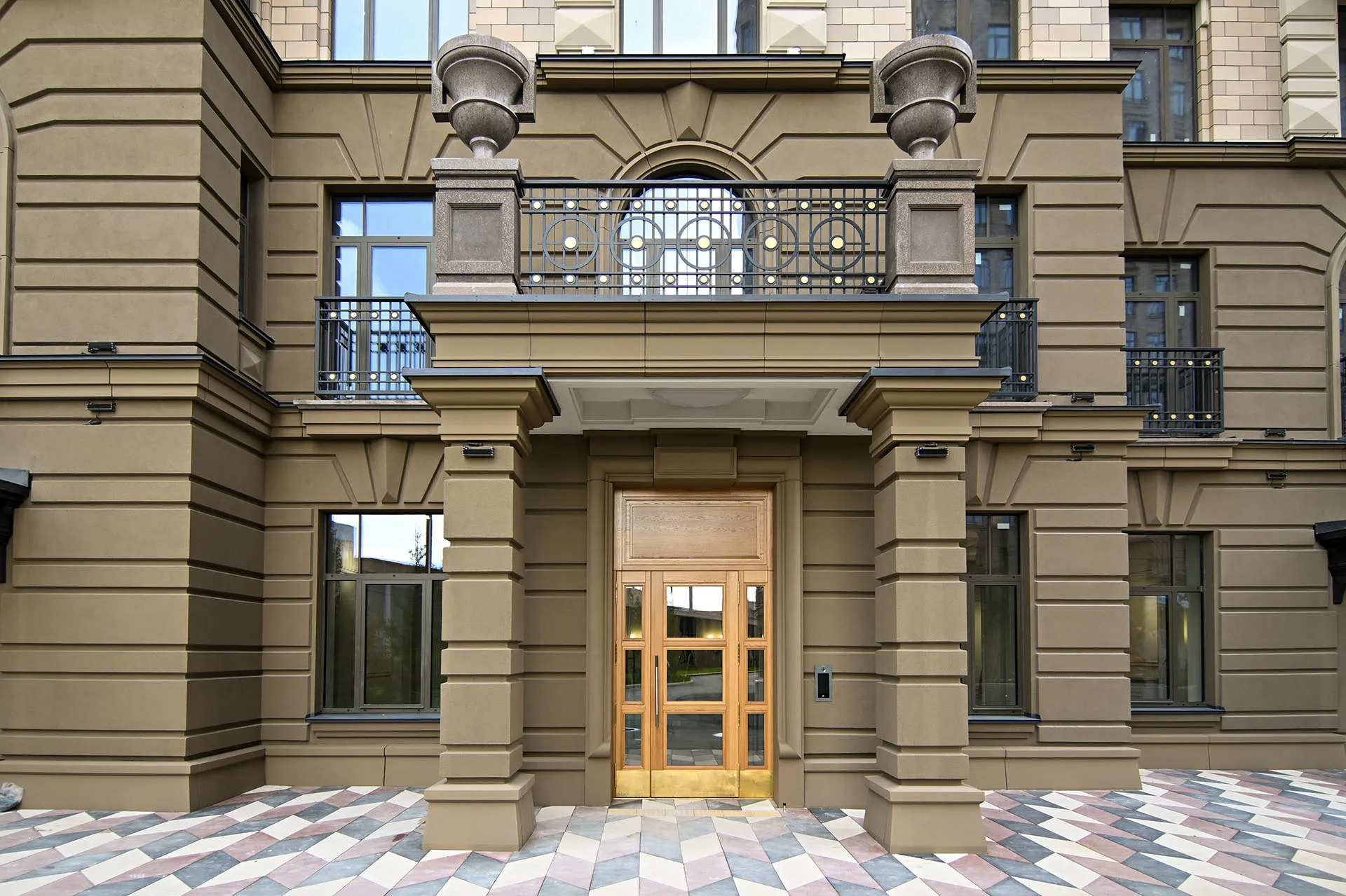 «Проект «Театральный квартал» воплощает стиль сталинского ампира. Дизайн парадных разработан по историческим эскизам ХХ века. Дома украшены эркерами, колоннами, карнизами и барельефами. На фасадах – русты из декоративного камня на нижних ярусах, на парапетах крыш – обелиски», – уточнила первый заместитель генерального директора концерна «КРОСТ» Марина Любельская.