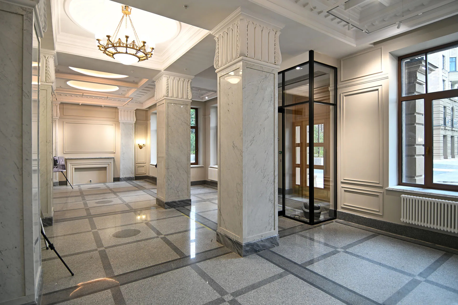 В каждом доме по одной входной группе, отделанной мрамором, деревом и керамогранитом. Внутри колясочная, почтовые ящики, стойка ресепшен и места для ожидания с диванами. Смонтировано по шесть лифтов: четыре пассажирских и два грузовых.