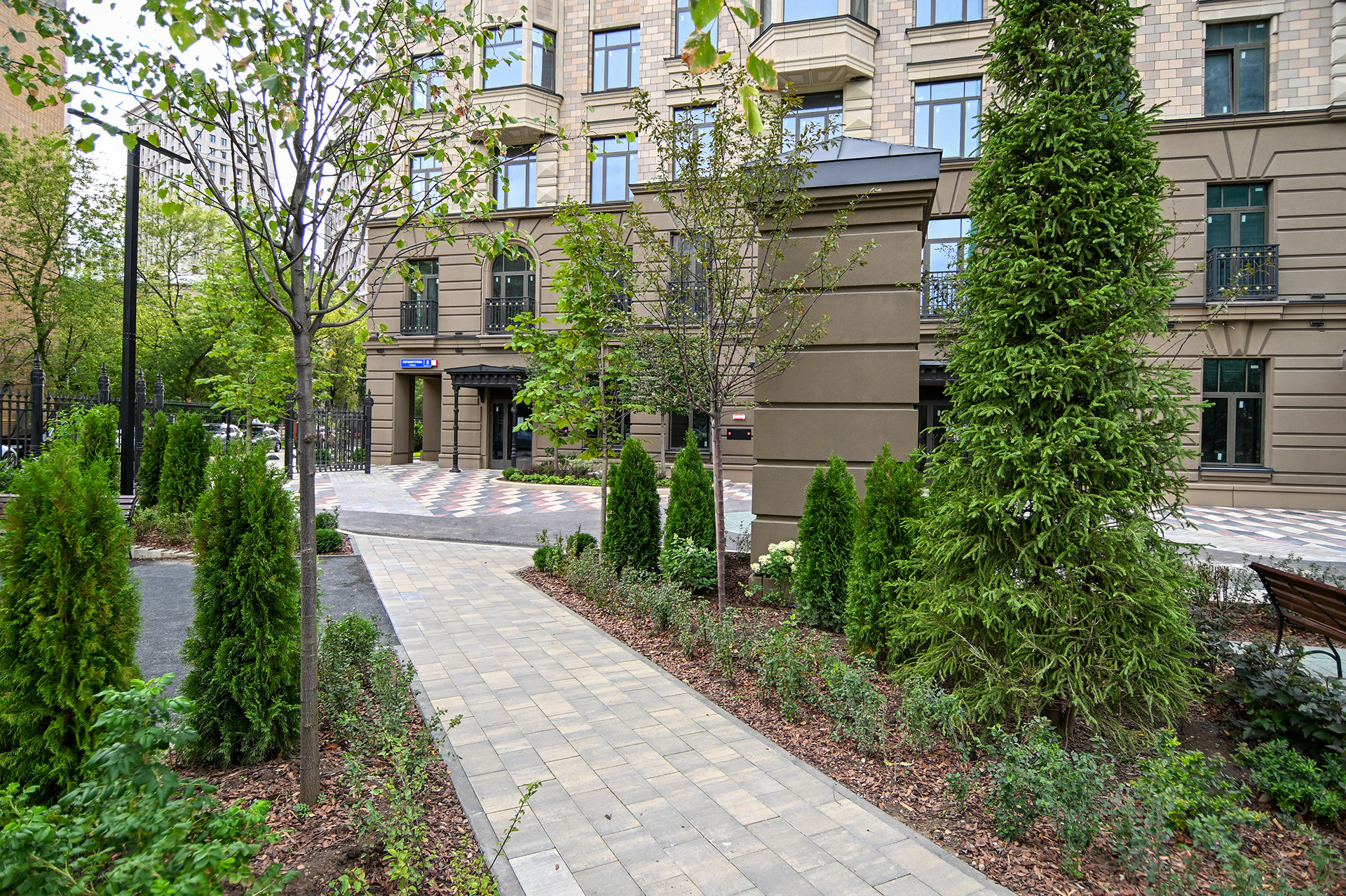 Пространство вокруг домов украшено многоуровневыми садами с обилием зеленых растений. Обустроен регулярный парк с клумбами, палисадниками с многолетними цветами и шпалерными липами. Парковый ансамбль оформлен из натуральных материалов и украшен художественный плиткой.
