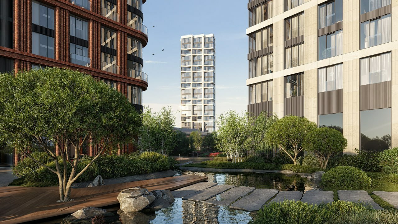 Из дома открываются виды на двор-парк с насыщенным озеленением, Москва-Сити и МИД.