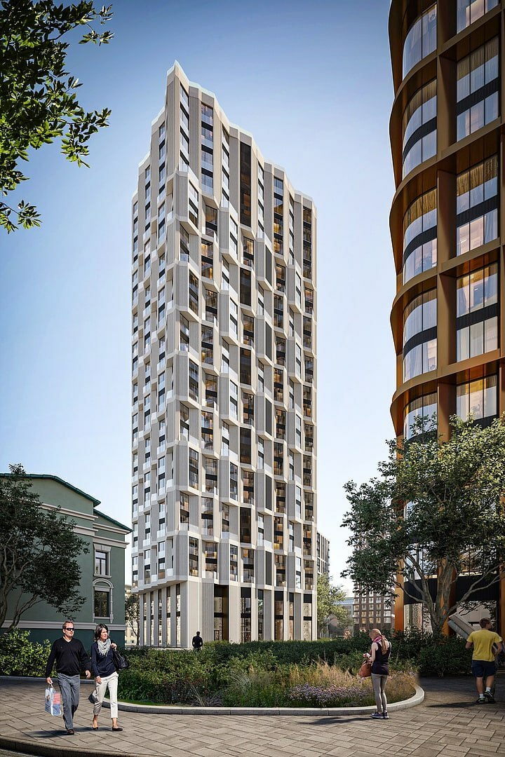 Натуральный белый известняк создаёт визуальный ритм фасада корпуса, а изящные рустованные панели добавляют динамики. Два первых этажа здания занимает частный детский сад на 40 мест с собственной игровой площадкой на территории квартала и двухсветное лобби с потолками высотой 8,8 метра, откуда можно попасть в жилую часть дома. Здесь предусмотрены лифты, мебельная группа и зона библиотеки.