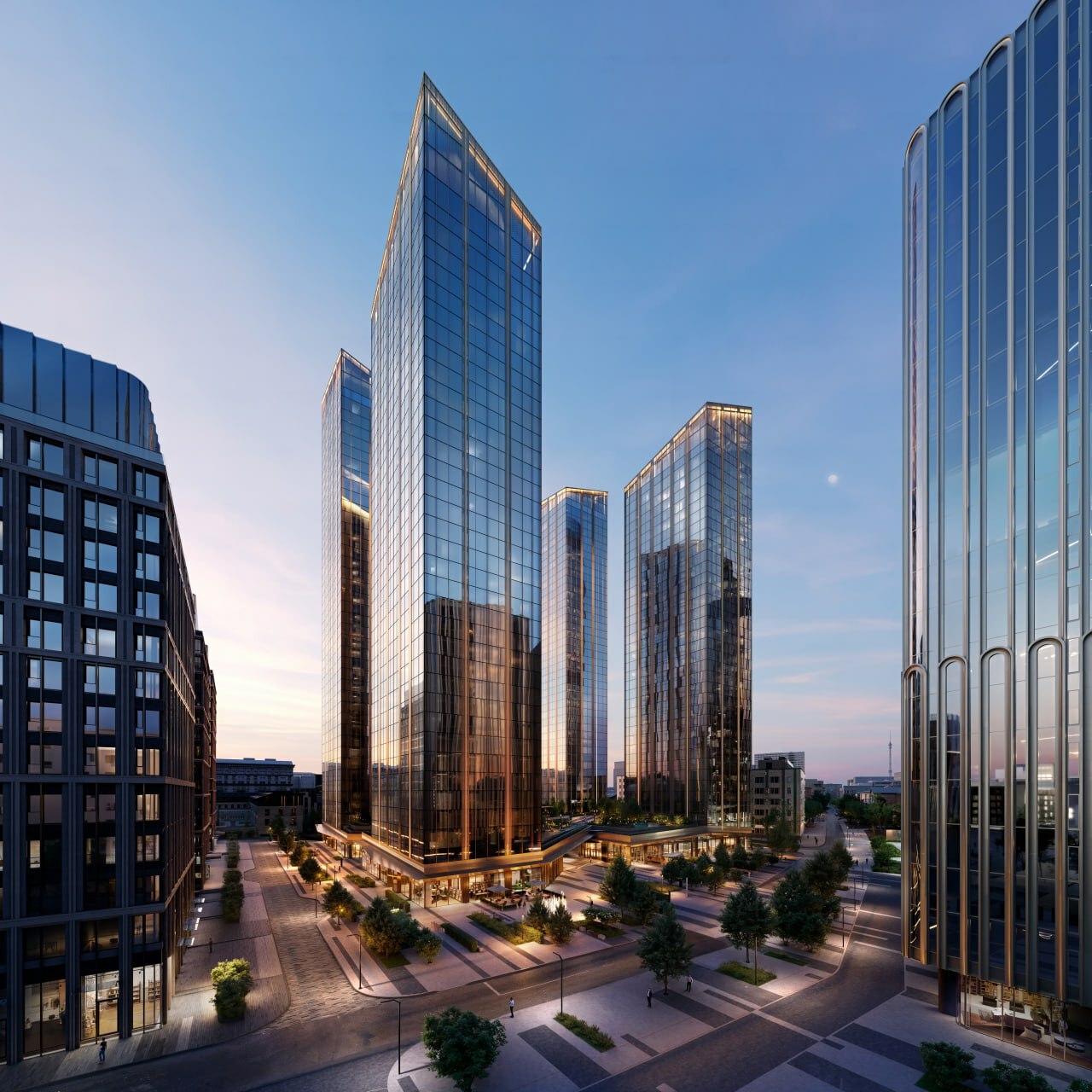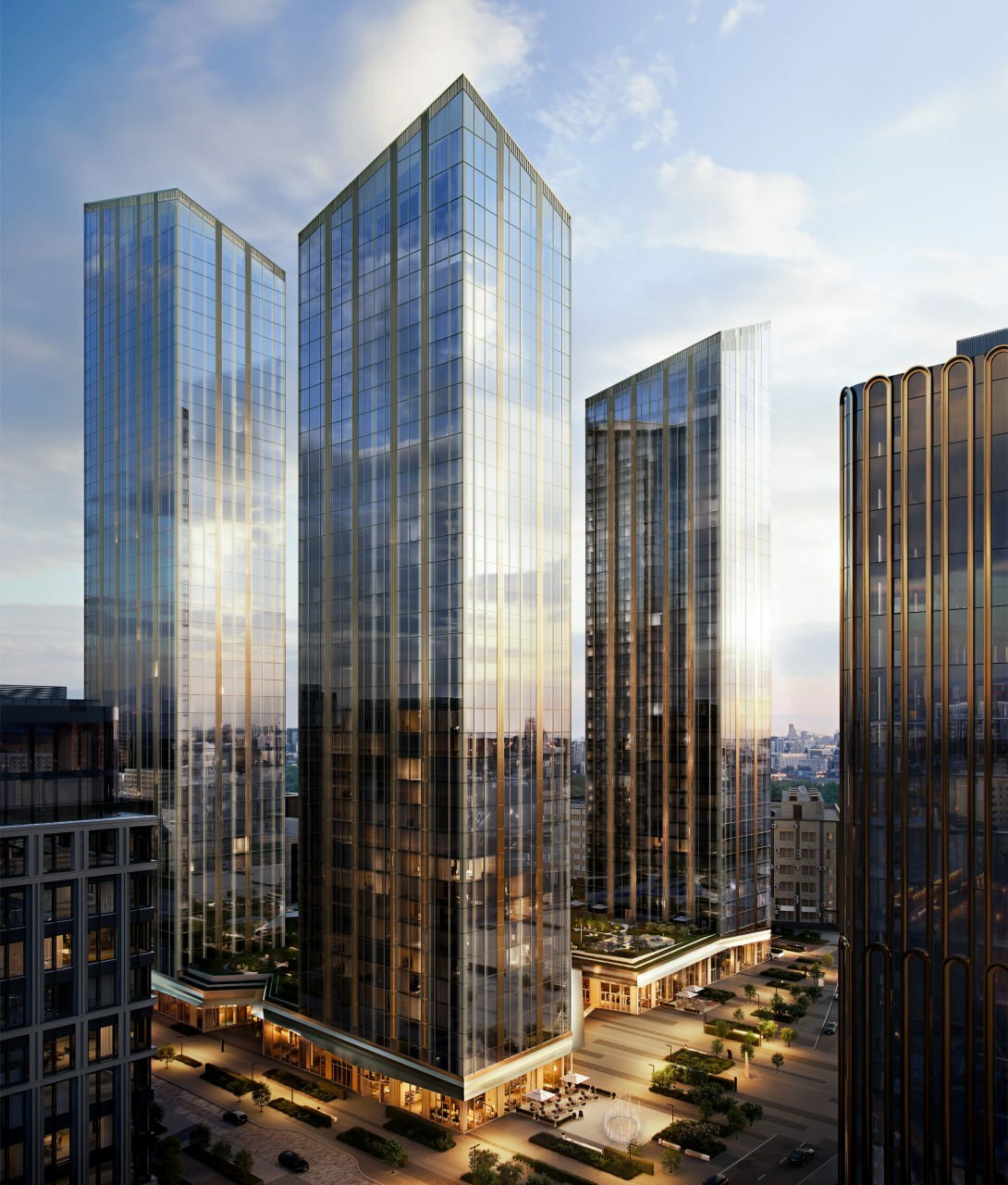 Отличительный элемент зданий переменной этажности — 34–41 этаж — скошенные короны, обращенные в сторону внутреннего двора. Они также будут выполнены из стеклянных модулей, а в каждой из них расположатся террасы для жителей. Завершить строительство башен планируется в II квартале 2027 года.